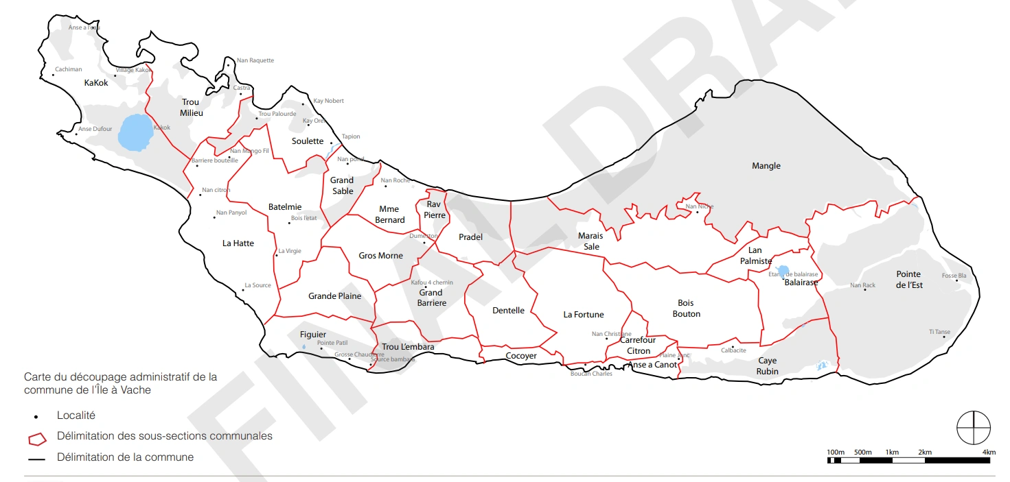 | IVA | 1ère Section Île-à-Vache | Rural section | 13,333 | Aux Palmistes, Bois Boutou, Boutte, Cacoq, Grand-Barrière, Gros-Morne, La Hatte, Mme Bernard, Pradel, Richard, Roche, Trou l'Embaras |