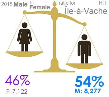 According to a 2015 demographic study by the Haitian Institute of Statistics and Informatics (IHSI), Île-à-Vache has a population of approximately 15,000 residents. This constitutes 2% of the South Department's population and only 0.14% of Haiti's national population. The island is sparsely urbanized, with just 13% of residents living in urban areas.