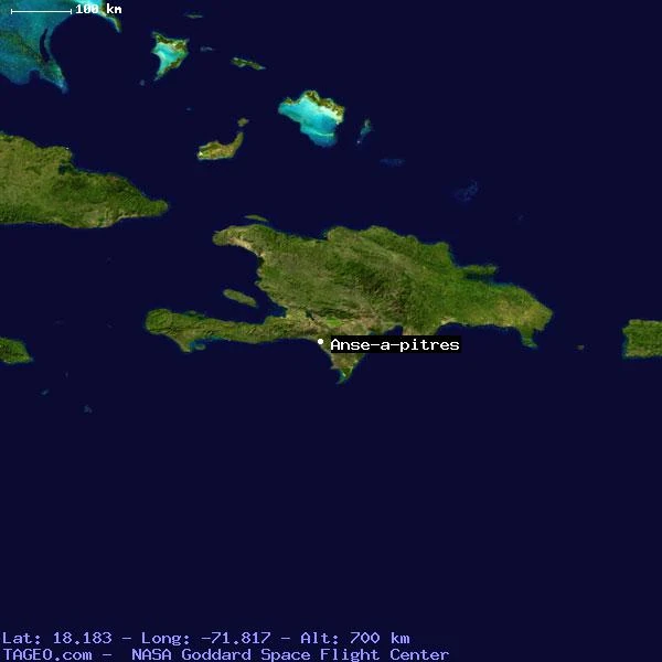 Anse-à-Pitres is located at 18.0454° N, 71.7578° W. According to the IHSI, this commune has a total land area of 185.19 square kilometers (71.50 square miles), of which 121.16 km² (67%) is suburban, 39.58 km² (22%) is rural, and 4.45 km² (3%) is urban. It has two expansion areas: Aviation and La Saline, which are considered as "slums", two communal sections, and a district. It is bordered by the Western Department town of Fonds-Verrettes to the north, the Dominican Republic town of Pédernales to the east, and the town of Thiotte to the west. The Caribbean Sea bathes it to the southwest. The town is drained by the Pedernales River, which flows into the sea near the village.