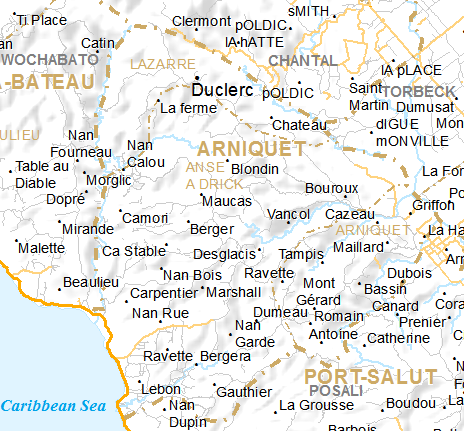 | 2ème Section Anse-à-Drick | Rural | 15,685 | Berger, Bergera, Blondin, Bouroux, Camori, Carpentier, Ca Stable, Desglacis, Dumeau, Gauthier, La Ferme, Lebon, Marshall, Maucas, Nan Bois, Nan Calou, Nan Garde, Nan Rue, Ravette, Vancol | ||