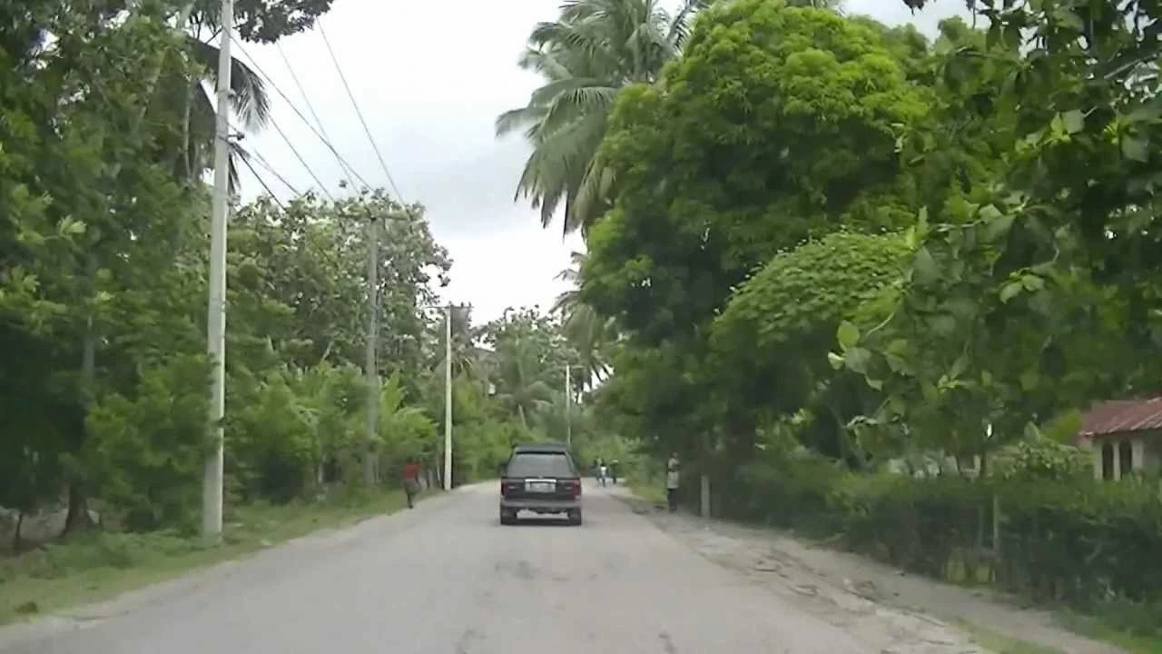 Vehicles driving past a small business on a country back road; Arniquet, Haiti