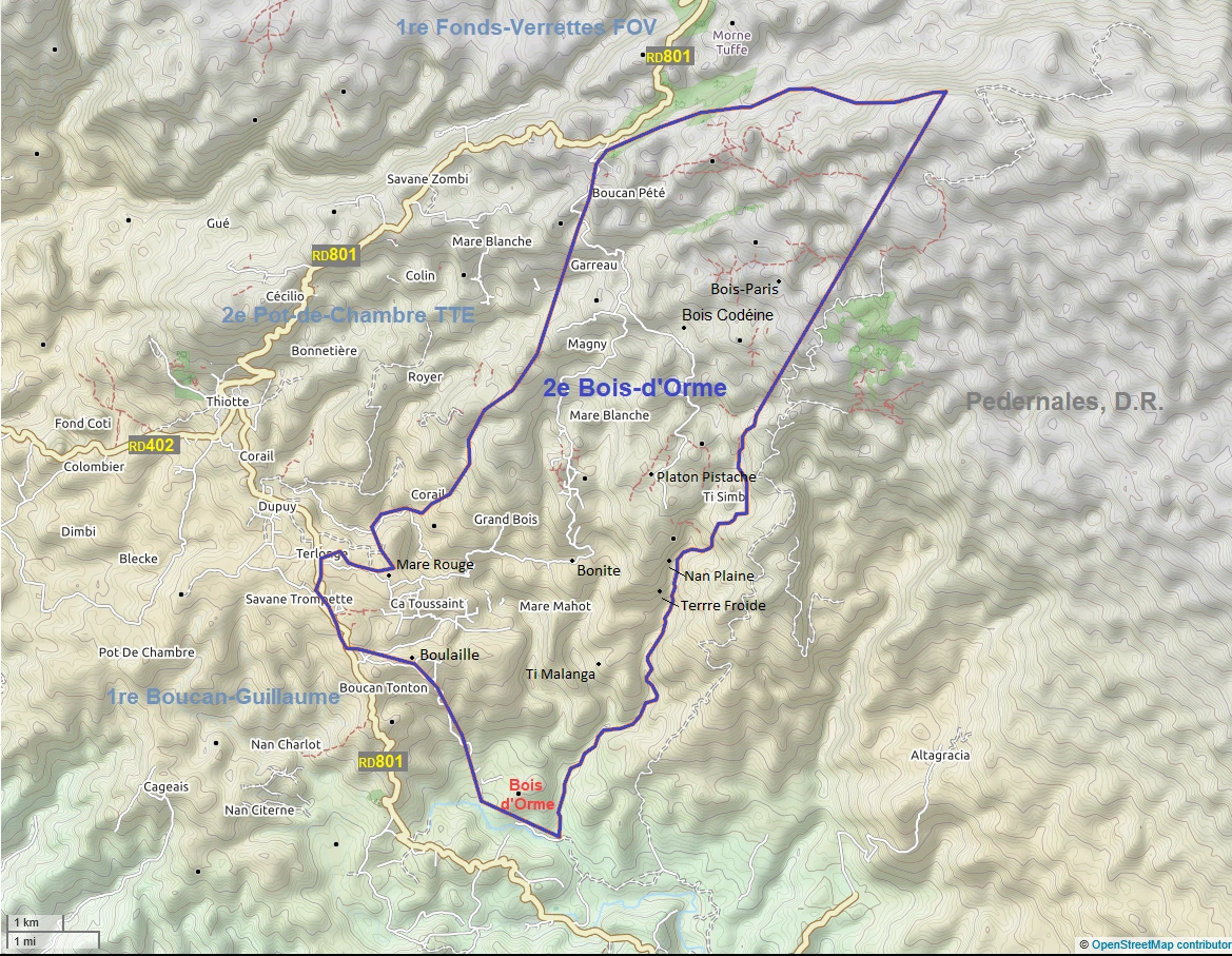 Bois D'Orme is located in the northern half of the commune of Anse-à-Pitres. It has an area of 57.71 km 2 and a population nearing 8,000 in 2000 and 8600 in 2003. Bois D'Orme is at a distance of 72.3 km from Jacmel and 59.9 km from Port-au-Prince. The section specializes in coffee growing and market gardening.