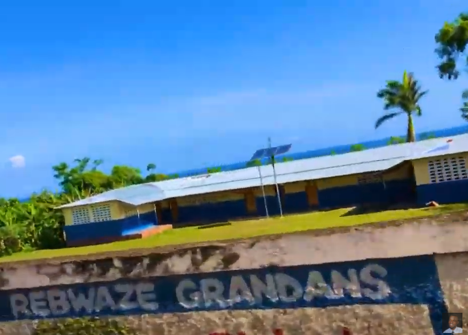 Sign outside the Bonbon National School ("Always sneeze into your elbows.")