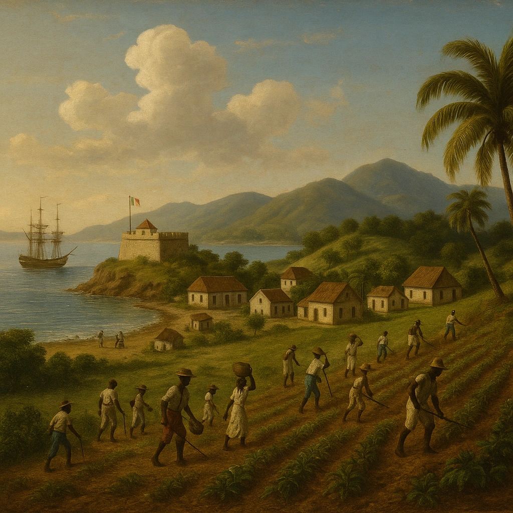 A recreated scene of Corail, Saint-Domingue (the name changed to Haiti in 1804) during the colonial era, showing the coast, plantations, and French fort.