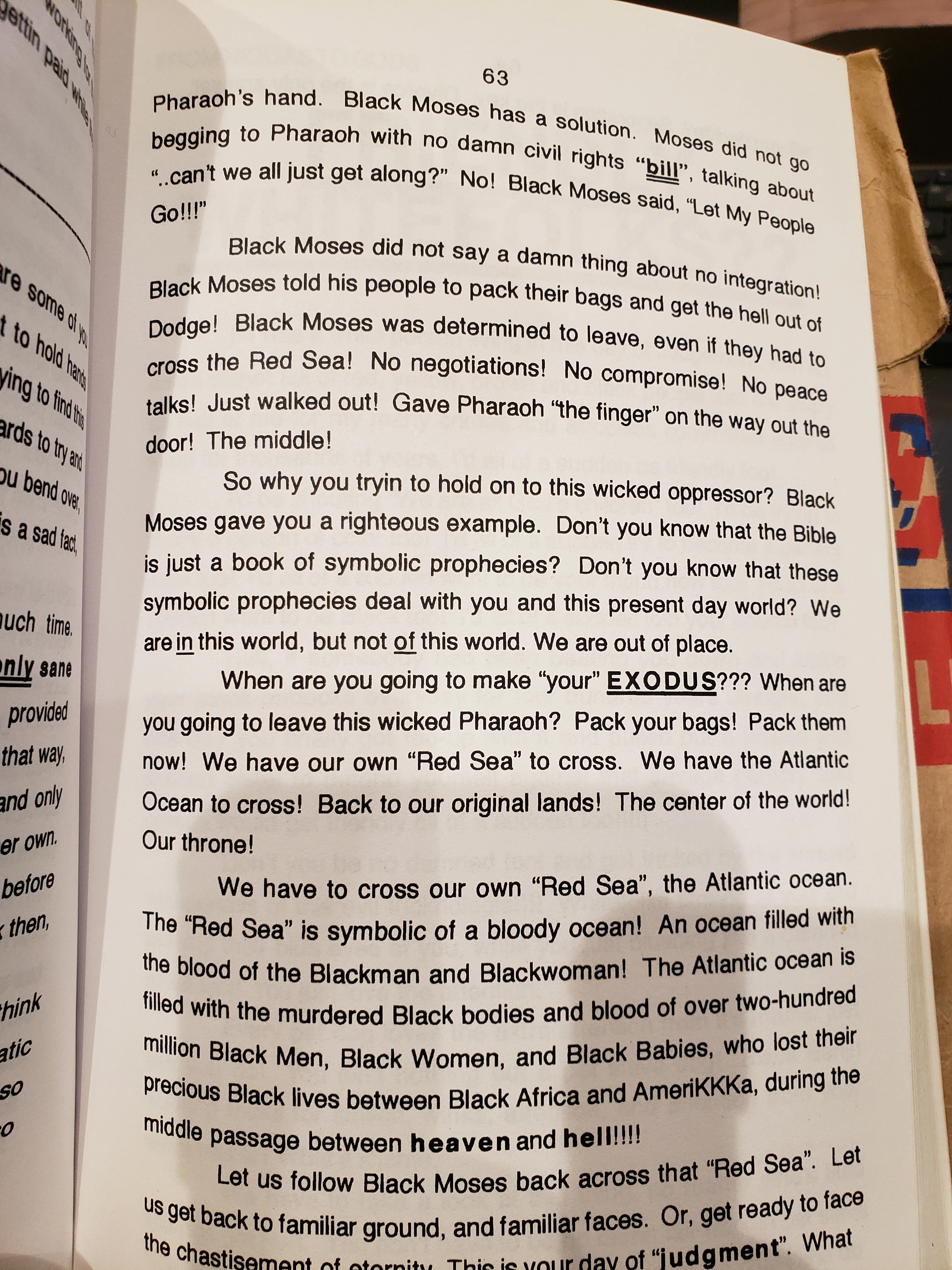 Nou dwe travèse pwòp pa nou "lanmè Wouj", oseyan Atlantik la. "Lanmè Wouj la" se senbolik yon oseyan san! Yon oseyan ki te ranpli avèk san nonm Nwa ak fanm Nwa! Oseyan Atlantik la plen ak kadav Nwa yo touye ak san plis pase desan milyon Gason Nwa, Fanm Nwa, ak Tibebe Nwa, ki te pèdi lavi Nwa presye yo ant Afrik Nwa ak AmeriKKKa, pandan pasaj mitan ant syèl la ak lanfè!!!!