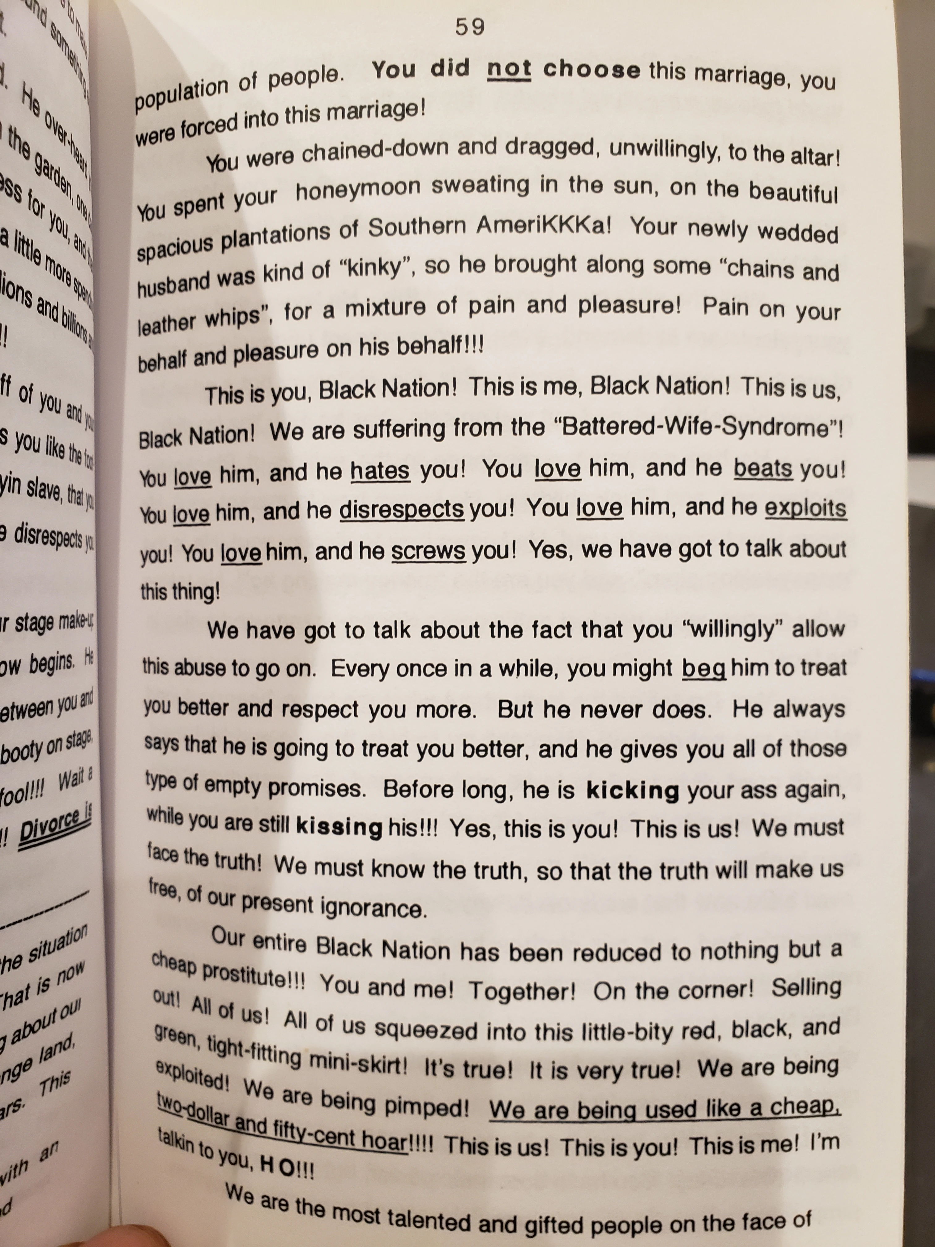Kidonk kounye a ke nou konnen sa, poukisa nou pa jis leve soti nan kabann sa a etranje a, mete rad nou sou nou, pou kouvri toutouni inyorans nou, epi kòmanse refòme tèt nou pou tounen yon Nasyon Nwa respektab ankò. Mwen pa vle vin yon "putain" ankò! Ann di tchoul blan sa a ke nou pa "a vann" ankò, paske kounye a li ka bo dèyè nwa nou gratis!!!