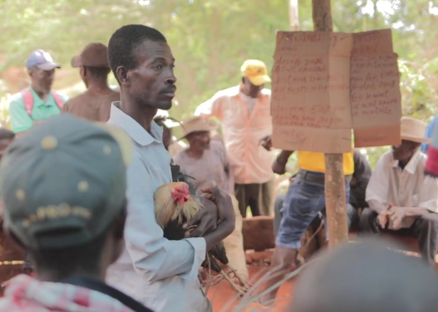 Livestock is handled with care and intention, as seen in the way a farmer carries his rooster during a community market day.