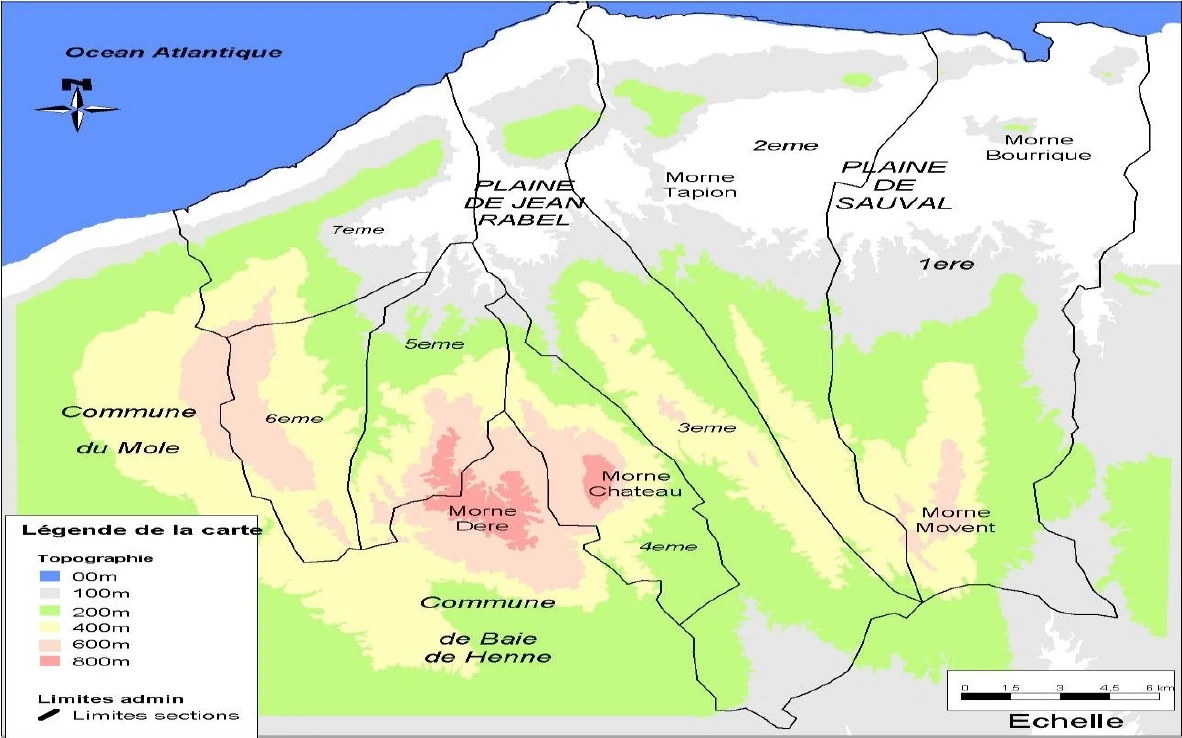 The commune lies roughly 32 km (20 miles) from Môle Saint-Nicolas, 40 km (25 miles) from Port-de-Paix, and about 250 km (155 miles) northwest of the capital, Port-au-Prince. It occupies a mountainous region defined by two prominent ranges: the Saint-Nicolas Mountains, home to peaks like Pic Morvan (800 meters / 2,400 feet) and Mont Château (840 meters / 2,520 feet), and the Jean-Rabel Mountain Range, which reaches up to 850 meters (2,550 feet). These are both subranges within the greater Northern Mountain Range, the dominant mountain chain running across northern Haiti.