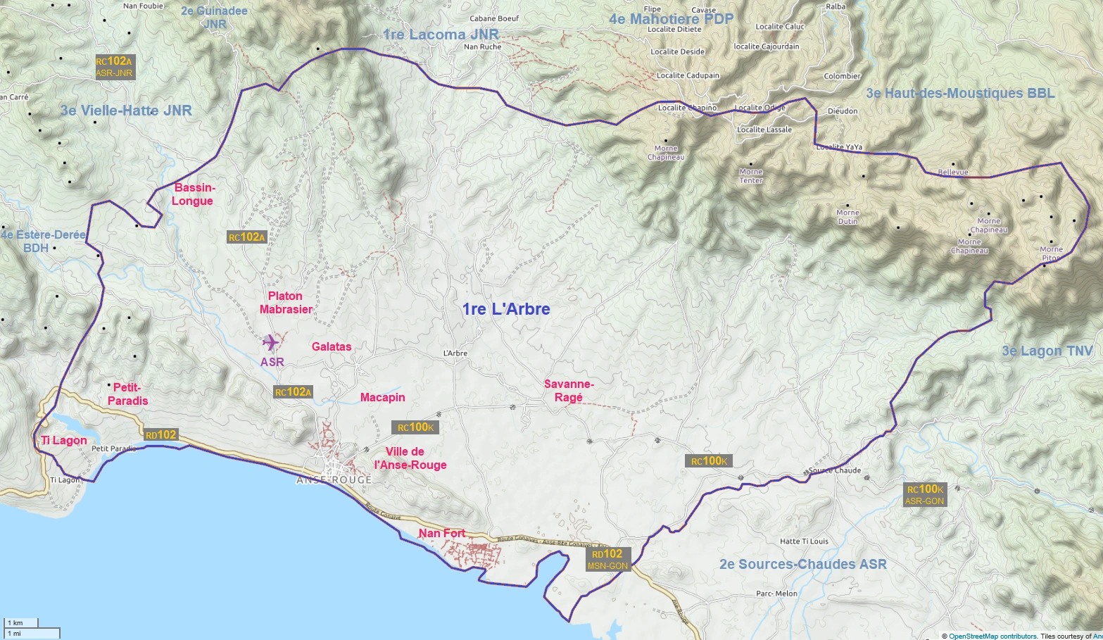 | Bassin-Citron, Bassin-Long, Bois Blanc, Chapineau, Chauvelin, Chevalier, Colline Ti Jean, Deborde, Derrière Anse-Rouge, Derrière Fort, Derrière Port, Digoterie, Duverneuille, Forcéli, Galatas, Glacis, Grand-Boulaille, Grand-Diable, Grande-Ravine, Grand-Platon, Hatte-Chevalier, Homme-de-Paille, Lan Boucan, L'Arbre, La Rocou, Macapin, Maforouget, Magasin-Dégan, Mare-Milien, Mare-Zanglais, Marie-Rose, Marodia, Moule-à-Manchette, Nan Borrin, Nan Coton, Nan Dimanche, Nan Fort, Nan François, Nan Palmiste, Nan Papaye, Nan Piquant, Nan Rameau, Nan Saut, Nan Vincent, Nan Yosse, Petit-Paradis, Plaine-de-l'Arbre, Platon, Platon-de-Paille, Platon-Mabrasier, Platon-Tache, Raque-Lambert, Roche Rouge, Saline Grand-Port, Savane-Ragé, Sources-des-Barres, Terre-des-Nègres, Tête-Boeuf, and Zoranger. |