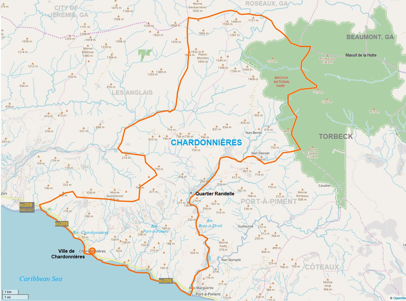 Chardonnières is a coastal commune located approximately 45 kilometers (28 miles) west of Les Cayes and is bordered by the Caribbean Sea to the south and west, the Hood Mountain Range to the north, and the commune of Port-à-Piment to the east. Covering about 117 square kilometers (45 square miles), the area features both flat coastal plains and rugged hills. The commune is administratively divided into four main sections: Bony, Déjoie, the district of Randel, and the city center.
