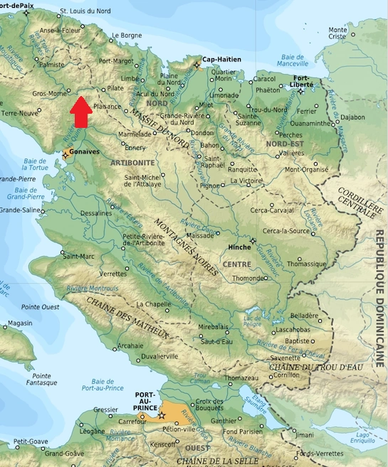 The valley of Riviere la Quinte has little relief. Along the road from Gonaives to Gros-Morne the divide between Riviere Is Quinte and Les Trois Rivieres has an altitude of 270 meters above sea level. The flood plain of Les Trois Rivieres northward from Gros-Morne is narrow, and the river swings in great loops against high bluffs. The lowland on both sides of the flood plain is strongly dissected and contains low, rounded hills and higher, narrower strike ridges. A conspicuous strike ridge on the east side of the valley, about 20 kilometers (12 miles) north of Gros-Morne, reaches an altitude of 560 meters (1,640 ft.) above sea level. These hills and ridges are dwarfed by the lofty mountains behind them, in the western part of the Massif du Nord. North of Gros-Morne the mountains west of the valley are not so high.