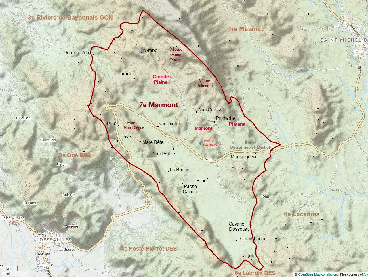 Historic Marmont consisted of two large communities: • Haut Marmont which included Haute-Cantave, Doco, Cour-Cadichon, Cherival, and Josemarie. • Bas Marmont which included areas like Centre Marmont, Haibon, Savane-Plate and Lamesette.