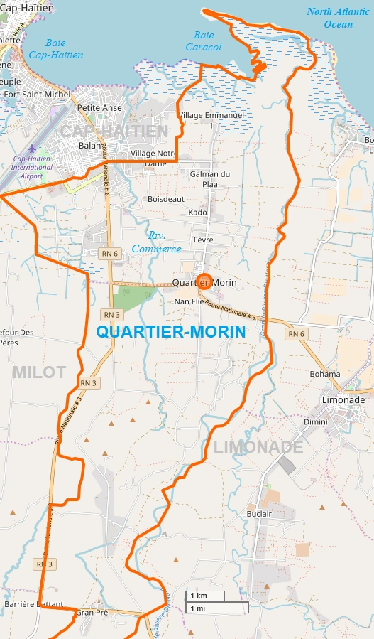 Quartier-Morin is bordered to the north by the Atlantic Ocean, to the east by the town of Limonade, to the southeast by the city of Grande-Rivière, to the west by the town of Milot, and to the northwest by Cap-Haïtien. The town lies along the southeast corner of Baie du Cap-Haïtien, which forms a U-shaped harbor that indents the northern shore. A public beach is located along this harbor, providing recreational space for residents.