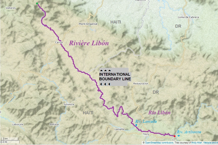 The Libon river enters the Dominican Republic and flows 5 kilometers (3 mi.) from the border on the right bank into the Artibonite River.