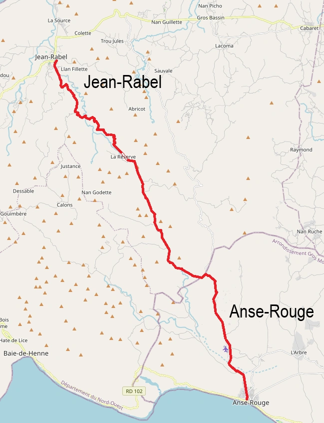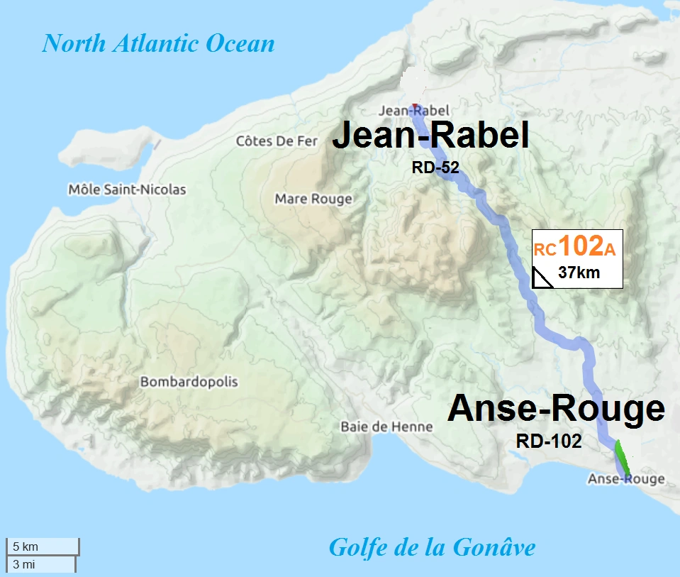 Route Communale 102-A (RC 102-A) is a 41-kilometre (25 mi) local road in northwestern Haiti, connecting the communes of Anse-Rouge in the Artibonite Department and Jean-Rabel in the Northwest Department. The route begins at the intersection with Route 102 in Anse-Rouge and extends northward, passing through several rural communities before reaching Route 52 in Jean-Rabel.