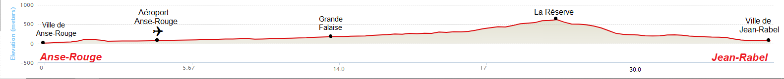 Continuing past the Anse-Rouge Airport, the terrain gradually becomes hillier, with the road winding between fields and scattered hamlets. About 7 km (4 mi) from the start, the route reaches the Jean-Rabel municipal boundary, entering the 3rd section, Vielle Hatte, where the hills rise a bit more and the vegetation becomes denser. The road here narrows in places, requiring careful navigation as it curves along ridges and small ravines.
