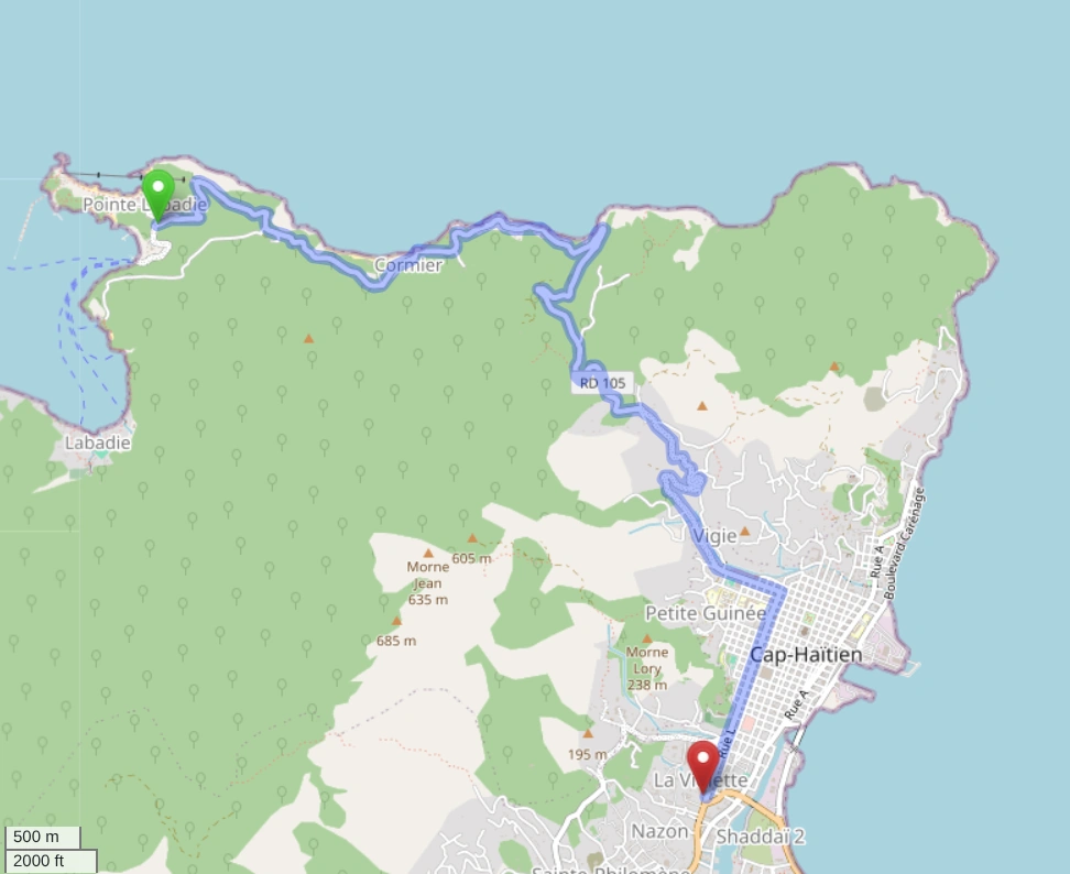 Route begins at the intersection of National Routes 1 and 3 in Cap-Haïtien. From this point, Route 105 heads north on Rue L, a street characterized by its narrow lanes and bustling atmosphere. Following L Street, the road conditions may vary, with sections of paved surfaces interspersed with areas requiring maintenance. It's advisable to drive cautiously, keeping an eye out for pedestrians, local vehicles, and occasional obstacles.