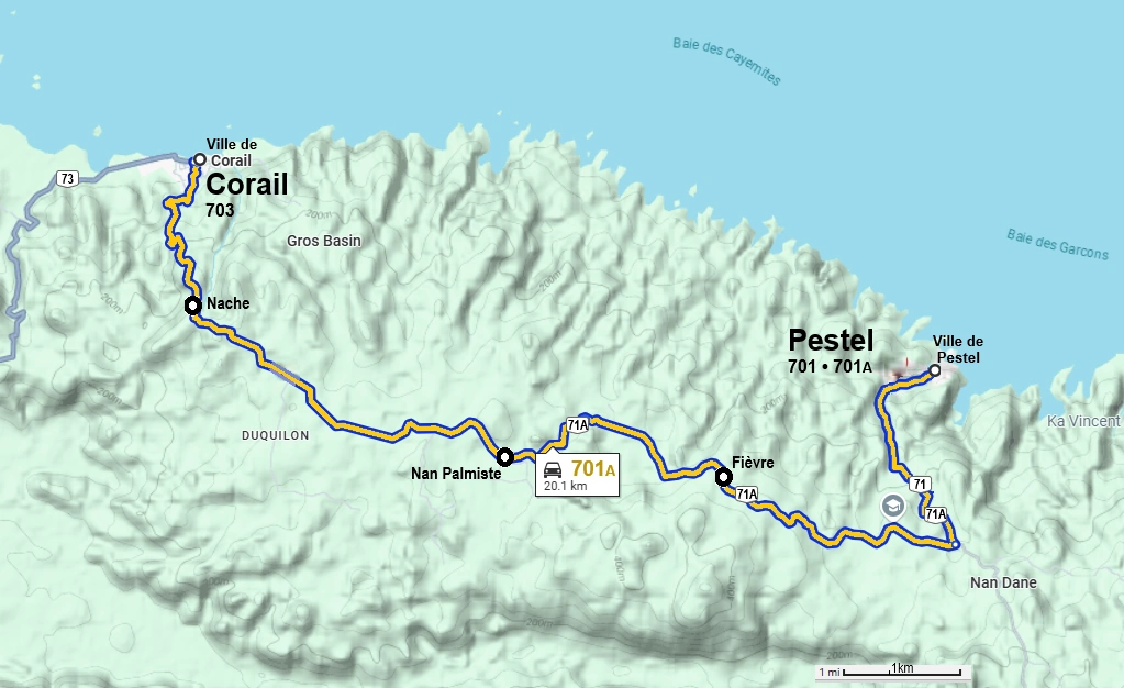 Route Departementale 701-A (or 71-A) is a rural east–west corridor linking the town of Corail with Pestel, traversing forested ridges, scattered hamlets, and remote agricultural zones across the Grand’Anse Department.