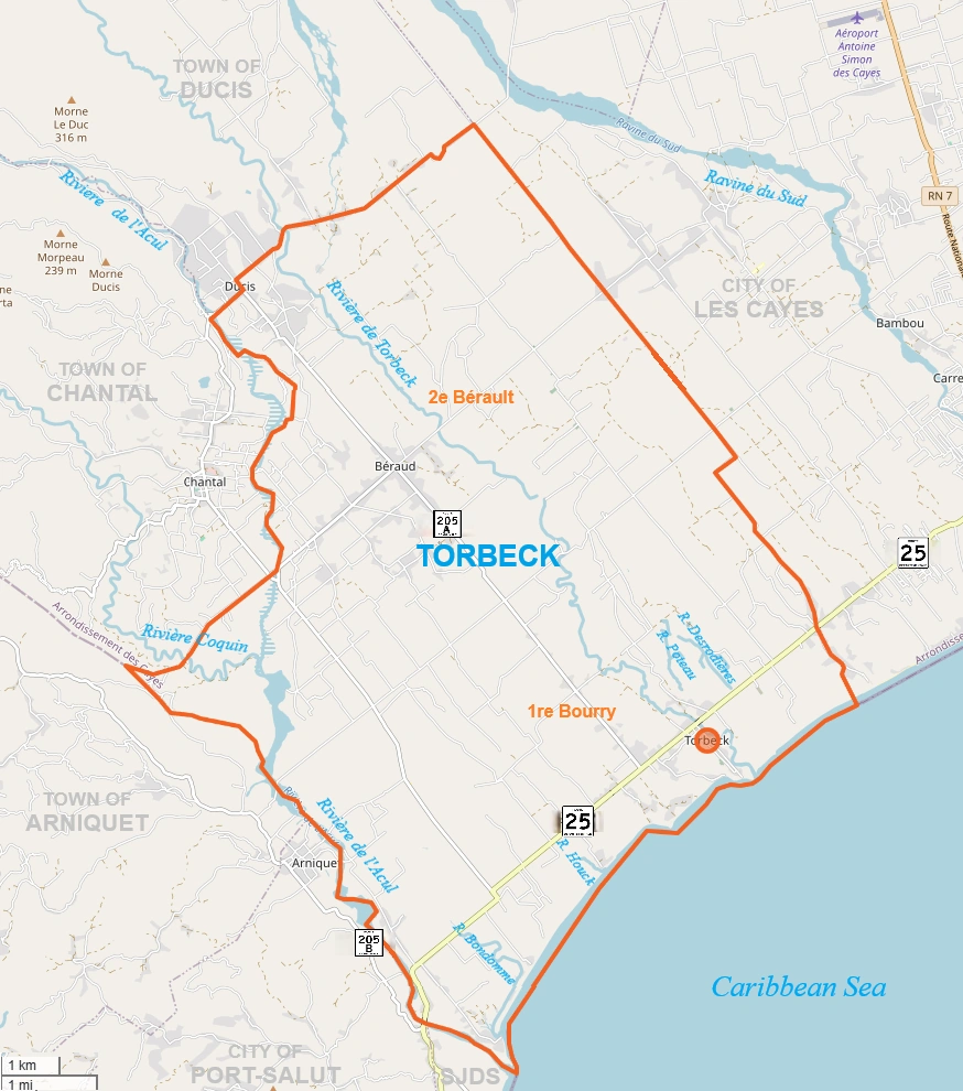 Torbeck is primarily served by Departmental Route 205, which functions as an extension of Route Nationale 2, connecting the commune to Les Cayes to the east and other coastal communities. In addition, Route Communale 205-A serves the commune, linking more remote rural habitations and acting as a secondary feeder road that complements Route 205. Together, these routes form the backbone of Torbeck’s road network, connecting the town center, Quartier Ducis, Quartier Ferme de la Blanc, and the four communal sections.
