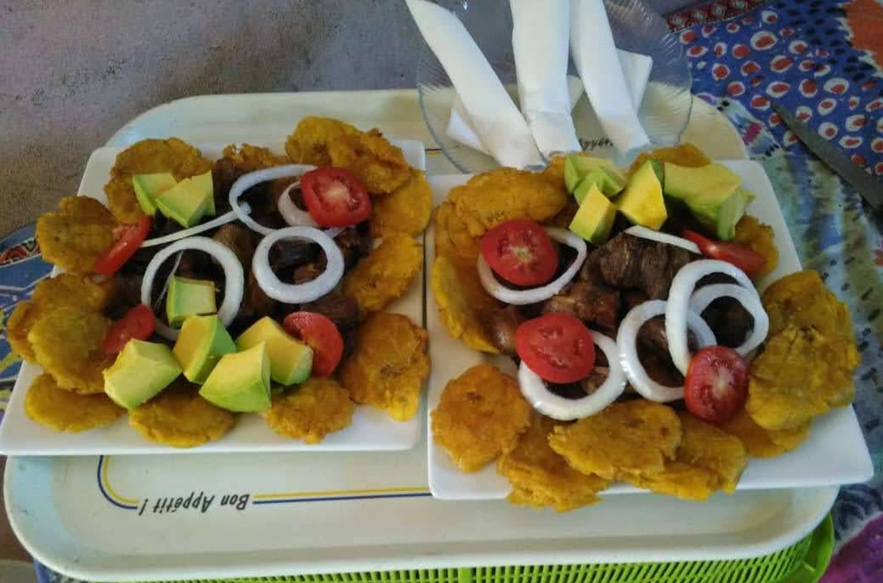 A classic Haitian platter of griot and bannann peze, topped with avocado, tomatoes, and fresh onions - Served at Vanise.